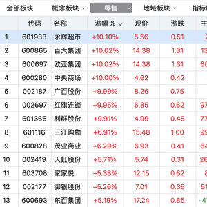 另外,茂业商业(600828)、三江购物(601116)、御银股份(002177)、天虹股份(002419)、家家悦(603708)等个股涨幅均超5%。