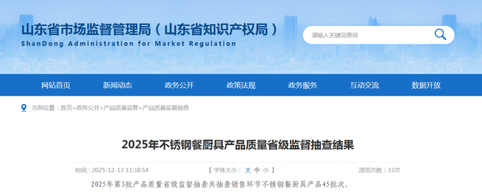 山东省市场监督管理局公布2025年不锈钢餐厨具产品质量省级监督抽查结果