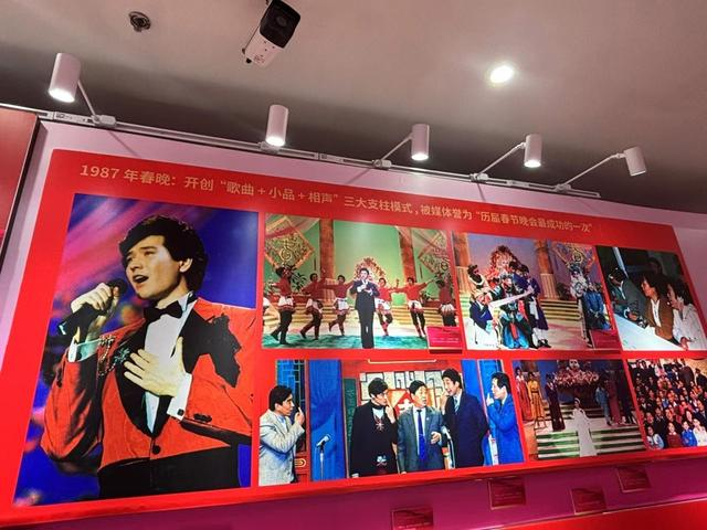 展厅一面展墙上集中呈现的1979年、1980年、1983年、1987年、1988年五届中央电视台春节联欢晚会剧照,同样牵动起观众的集体记忆——这五届春晚均由邓在军执导。她回忆,在执导春晚之前,曾与王扶林合作导演过一台“笑的晚会”,为拉近舞台与观众席的心理距离,尝试采用“茶座式”布局,取得良好效果。1979年,她又与杨洁将这一形式移植到羊年春晚,再次获得成功,并逐渐成为此后历届春晚沿用的重要舞台样式。1987年、1988年,邓在军独自担任春晚总导演。展墙上费翔在1987年春晚演唱《冬天里的一把火》的剧照尤为醒目,伴随“迪斯科”舞步的热烈场景,那充满动感的旋律至今仍镌刻在一代人的记忆中。