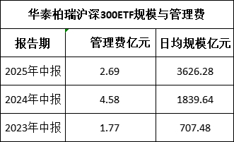 降费影响立竿见影,数据显示,2025上半年华泰柏瑞沪深300ETF(510300)日均规模3626亿元,半年收取2.69亿元管理费;2024上半年该基金日均规模1839.6亿元,管理费4.58亿元。也就是说,华泰柏瑞沪深300ETF基金规模暴涨接近翻倍,管理费仅相当于去年的6成。