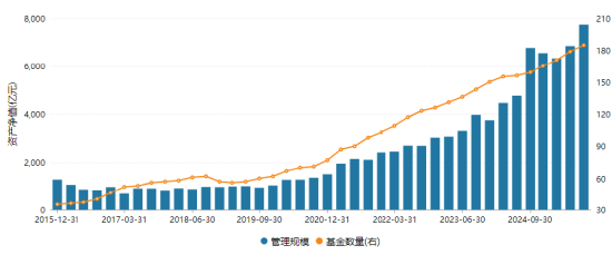 从规模看,2024年末,华泰柏瑞基金非货规模5795亿元,位居行业第8名;回顾2015年末,华泰柏瑞基金非货规模650.94亿元,位居行业第19名。也就是说,华泰柏瑞非货规模是十年前的8.9倍。
