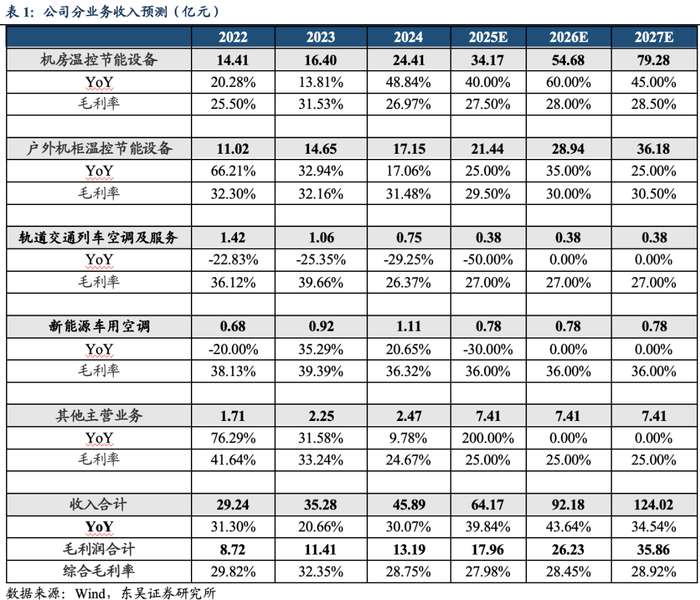 (1)机房温控节能设备:AI算力服务器需求爆发,对应机房温控节能设备市场空间扩容,公司有望通过导入海外供应链实现高增。我们预计机房温控节能设备2025–2027年收入分别为34.17/54.68/79.28亿元,同比增长40%/60%/45%;毛利率预计为28%/28%/29%。