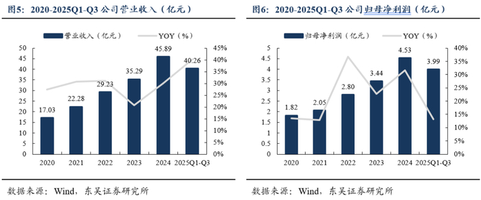 公司营收与归母净利润稳健增长。营收方面,2020-2024年公司营收由17.03亿元攀升至45.89亿元,CAGR达28%。公司近年来业绩稳健增长,主要得益于产品在通信、储能、数据中心等三大核心下游的持续开拓。2025Q1-Q3公司营收达40.26亿元,同比增速40.19%,继续保持高速增长态势。归母净利润方面, 2020-2024年公司归母净利润由1.82亿元增长至4.53亿元,CAGR为26%。其中2022-2024年归母净利润同比增速分别为37%、23%、32%,均高于同期营收增速,主要系公司毛利率水平稳健叠加费用率管控得当。2025Q1-Q3公司归母净利润为3.99亿元,同比增速13.13%,保持稳健增长。