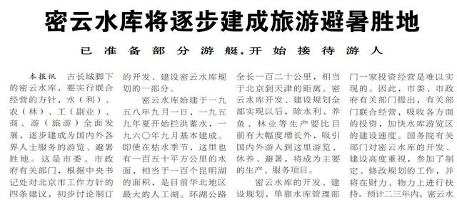 密云水库与长城相邻,风景优美,是我国华北地区最大的水库,素有“燕山明珠”之称,将其逐步建成旅游避暑胜地,是当时利用环境资源为首都添彩的选择。1980年春天,在水库白河大坝下的游船码头,5艘各载客10人至100人的游艇开始营业,游客乘坐“北京一号”游艇远眺湖光山色,仿佛是在“海上”航行。(1980年5月29日《北京日报》1版,《密云水库将逐步建成旅游避暑胜地》)