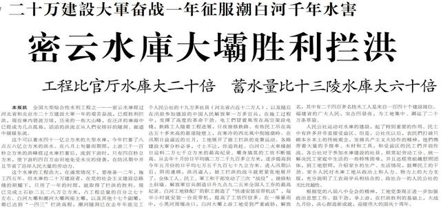 大雨过去,水库内碧波万顷,滔滔洪流从隧洞、廊道中缓缓东流。来自京津冀三地的20万建设大军终于征服潮白河千年水害,并在1960年9月建成密云水库。这“一年拦洪两年建成”的壮举,创造了中国水利史上的奇迹。