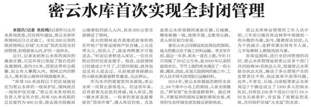 为更好地护住一池净水,2018年初,全长280公里的密云水库环库围网竣工,京城“大水盆”首次实现全封闭管理。密云区水务局相关负责人介绍,“库周155米高程以下的区域被划定为密云水库的一级保护区,围网就沿一级保护区而建。”(2018年1月4日《北京日报》5版,《密云水库首次实现全封闭管理》)