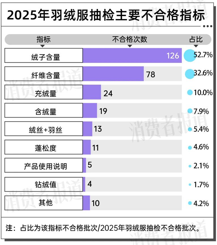 值得注意的是,绒子含量是今年羽绒服抽检出现不合格批次最多的指标,抽检发现的239批次不合格产品中有126批次因为该指标不合格,占比超过50%。