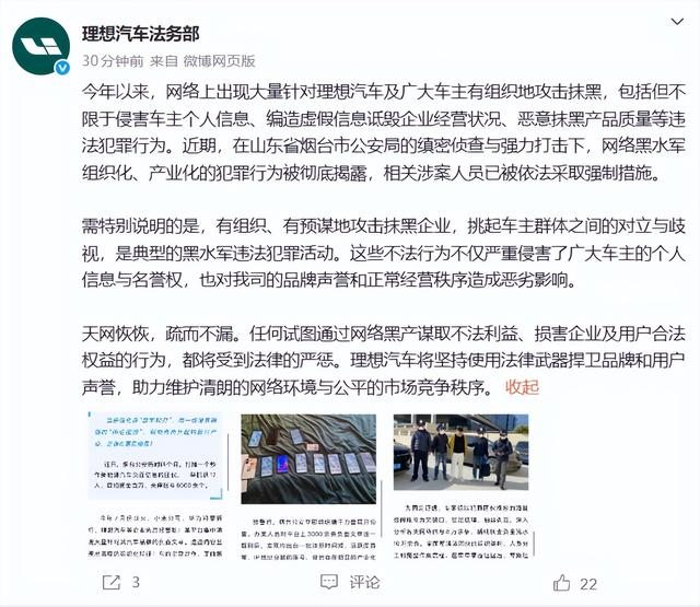 今年以来,网络上出现大量针对理想汽车及广大车主有组织地攻击抹黑,包括但不限于侵害车主个人信息、编造虚假信息诋毁企业经营状况、恶意抹黑产品质量等违法犯罪行为。近期,在山东省烟台市公安局的缜密侦查与强力打击下,网络黑水军组织化、产业化的犯罪行为被彻底揭露,相关涉案人员已被依法采取强制措施。