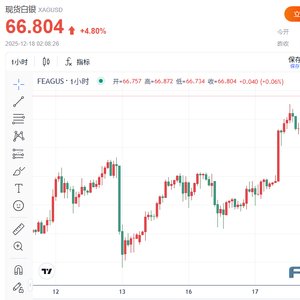 现货白银周三一度触及 66.872美元/盎司的历史高位,盘中涨幅扩大至逾4.%。纽约期银日内暴涨6.00%,现报67.13美元/盎司。