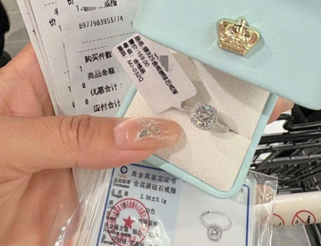 深入调查发现,这款被全网热议的“小方糖钻戒”,售价在169元到200多元不等,但并非真正意义上的“钻戒”。参考该戒指自带的鉴定证书可知,其品名为“925银合成碳硅石戒指”,即市面上常见的“莫桑钻戒”。