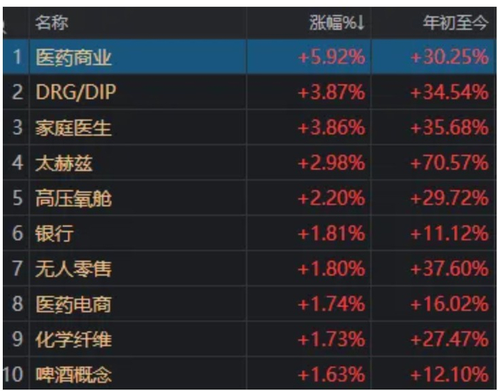 板块方面,医药商业、银行、零售等板块涨幅居前,电池、电网设备等板块跌幅居前。