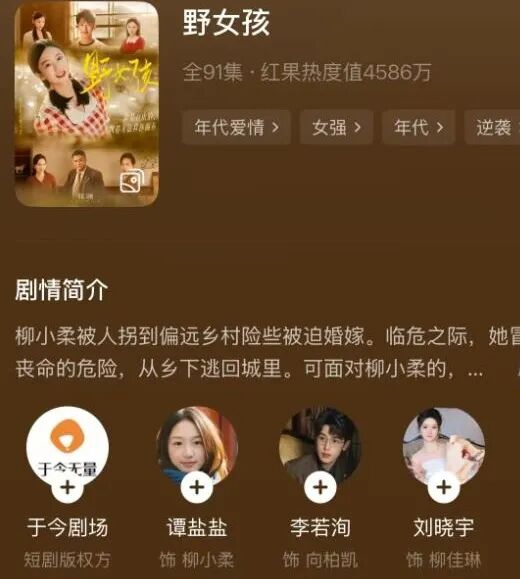 短剧《野女孩》以“荆棘丛中的野玫瑰终将冲破牢笼”为主题象征,上线4天即在红果短剧播放量破1.4亿