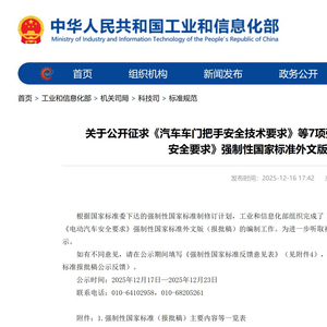 据工业和信息化部官网12月16日消息,工业和信息化部组织完成了《汽车车门把手安全技术要求》(以下简称《要求》)等7项强制性国家标准(报批稿)、《电动汽车安全要求》强制性国家标准外文版(报批稿)的编制工作。