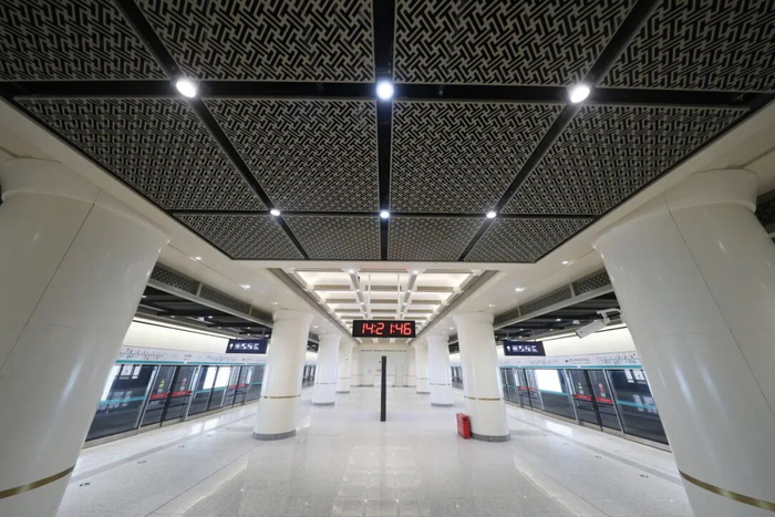 新线车站设计充分融合地域文化,永安里站采用新中式风格,以米色为主色调,衬以褐色线条与顶部藻井造型,展现中式空间之美;站内布置“东方之韵”主题壁画,创新运用玻璃瓦片融入故宫、太庙等经典古建筑剪影,传递北京文化底蕴与都市活力。潘家园西站则结合结构空间特点及周边文化元素,融入青花瓷、古画、花格等传统纹样,呼应站点周边文化氛围。