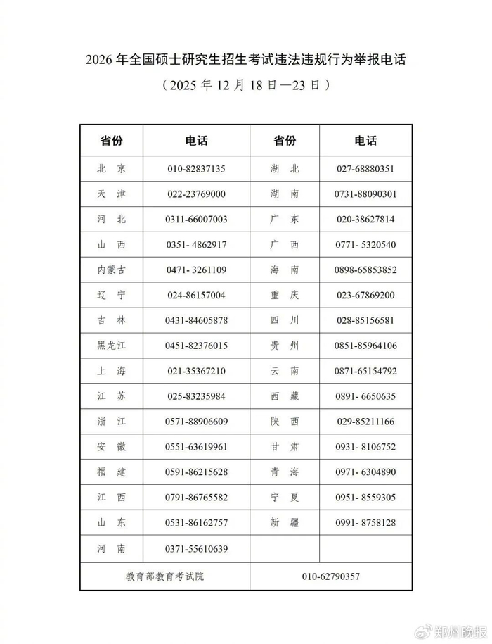 2026年全国硕士研究生招生初试时间为2025年12月20日至21日。12月18日,教育部公布2026年全国硕士研究生招生考试违法违规行为举报电话,邀请考生和公众参与监督。