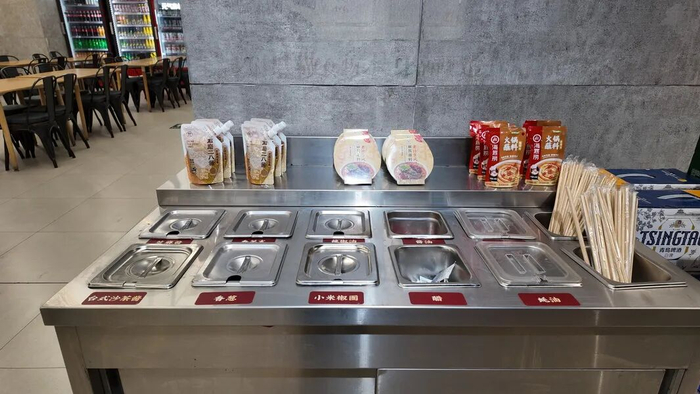 不仅是盒马鲜生,有着“青岛胖东来”之称的真诚超市也在布局餐饮化赛道。记者在刚开业的真诚超市北都广场店看到,虽然目前堂食区主打手工水饺,但商超货架上已摆满各类火锅食材,从冷冻肉卷、手打丸子到火锅底料、蘸料一应俱全。