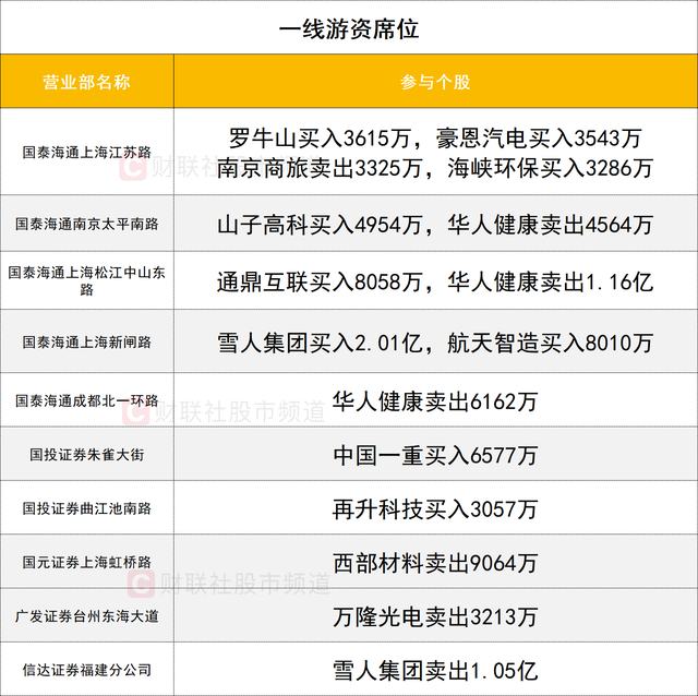 一线游资活跃度较高,AI医疗人气股华人健康冲高回落,三家一线游资(国泰海通证券上海中山东路、国泰海通证券成都北一环路、国泰海通证券南京太平南路)分别卖出1.16亿元、0.61亿元、0.45亿元。