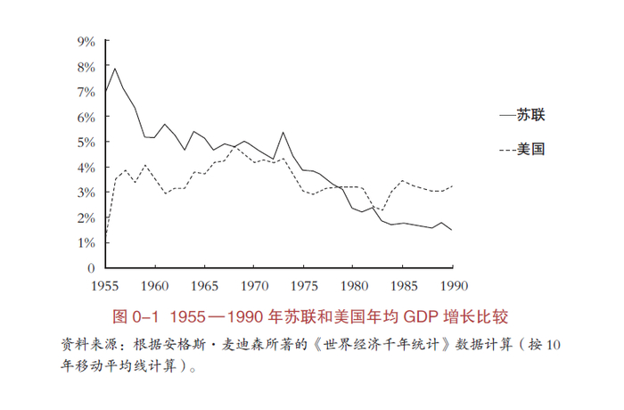 面对资本主义经济体的长期快速增长,苏联并未改变其经济结构。虽然苏联国内投资仍维持较高水平,但它仍然是一个相对自给自足的封闭经济体系。也就是说,它仍然被排斥在国际劳动社会化之外,保留了全盘国有化的城市经济、集体农庄。处于社会主义初级阶段的苏联的这种经济结构并不符合马克思主义。结果是,20世纪60年代,苏联年均GDP增速不再快于美国,到20世纪70年代中期,苏联年均GDP增速实际上慢于美国(见图0-1),甚至到20世纪70年代中期,苏联已深陷经济危机。