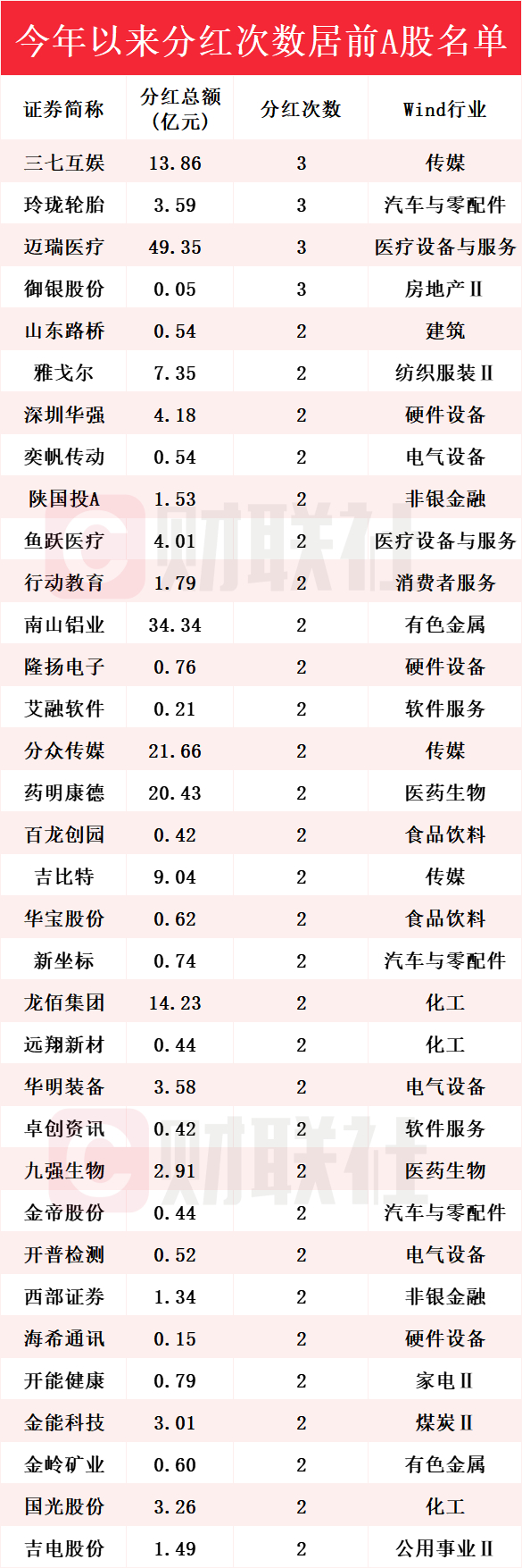 Wind数据显示,今年以来,A股上市公司迈瑞医疗、三七互娱、御银股份和玲珑轮胎分红次数均为三次。山东路桥、雅戈尔、深圳华强、奕帆传动、陕国投A、鱼跃医疗、行动教育、南山铝业、隆扬电子、艾融软件、分众传媒、药明康德、百龙创园、吉比特、华宝股份、新坐标、龙佰集团、远翔新材、华明装备、卓创资讯、九强生物、金帝股份、开普检测、西部证券、海希通讯、开能健康、金能科技、金岭矿业、国光股份和吉电股份分红次数均为两次。具体情况如下图: