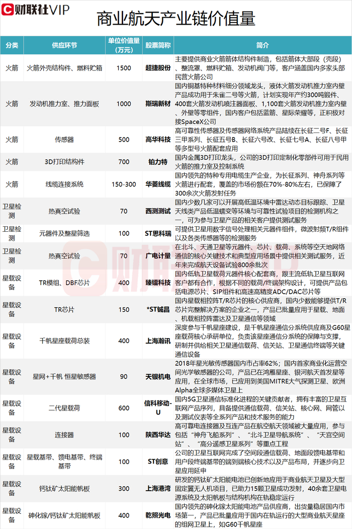 据财联社VIP盘中宝数据此前梳理,在商业航天产业链价值量中,在火箭领域,供应环节为火箭外壳结构件、燃料贮箱的单位价值量为1500万元,涉及的上市公司为超捷股份;供应环节为发动机推力室、推力面板的单位价值量为1000万元,涉及的上市公司为斯瑞新材;供应环节为传感器的单位价值量为500万元,涉及的上市公司为高华科技;供应环节为3D打印结构件的单位价值量为700万元,涉及的上市公司为铂力特;供应环节为线缆连接系统的单位价值量为150-300万元,涉及的上市公司为华菱线缆。