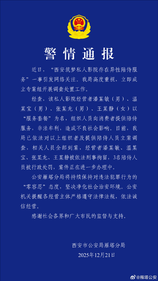 近日,“西安筑梦私人影院存在异性陪侍服务”一事引发网络关注。我局高度重视,立即成立专案组开展调查处置工作。