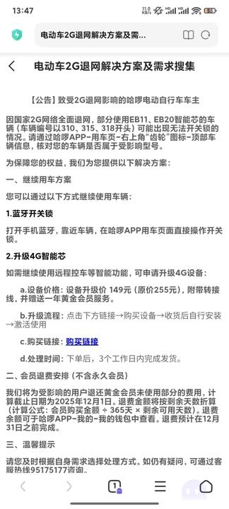 哈啰后续给用户发送的2G退网解决方案。