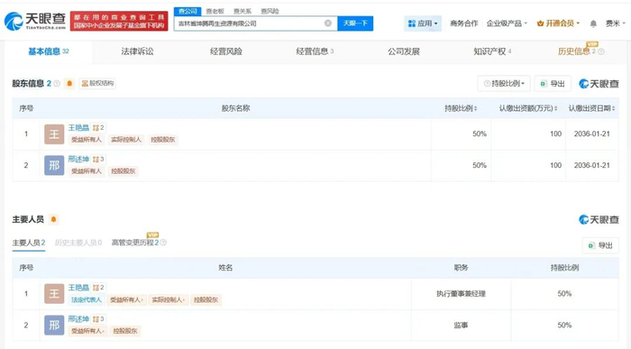 天眼查App显示,涉事企业吉林省坤腾再生资源有限公司成立于2016年1月,法定代表人为王艳晶,注册资本200万人民币,经营范围包括环保设备研发与销售、废旧纺织品研发与销售、防寒大棚被加工与销售等,由王艳晶、邢述坤共同持股。年报信息显示,该公司连续多年参保人数为0。