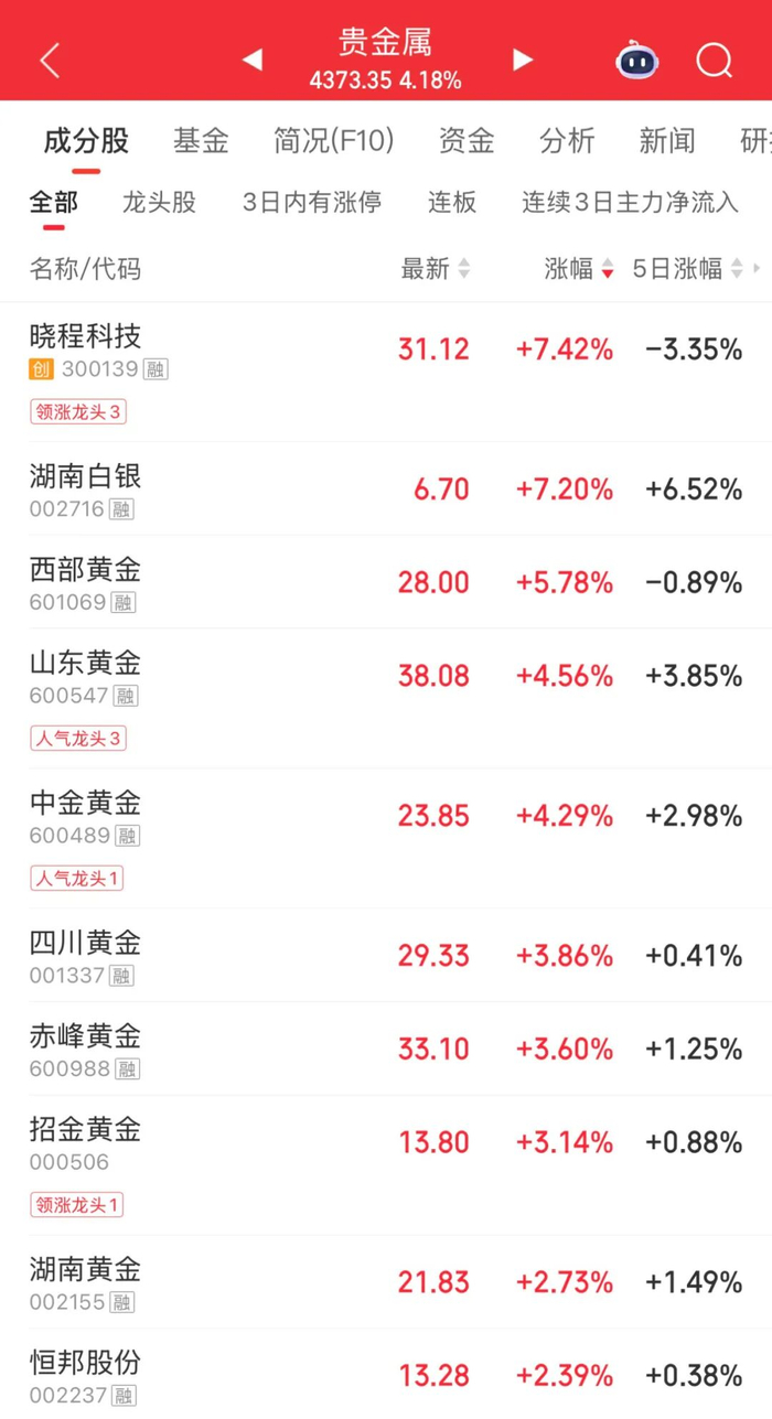 贵金属概念股全天震荡走高,截至收盘,同花顺贵金属板块涨4.18%。个股方面,晓程科技、湖南白银大涨超7%。