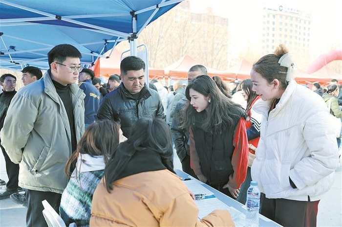 十四师昆玉市兵地融合招聘会现场,求职者在一家企业的展位前了解岗位信息(资料图片)。十四师昆玉市不断完善重点群体就业支持体系,针对高校毕业生、退役军人、就业困难人员等重点群体,坚持市场化社会化就业与政府帮扶相结合,促进多渠道就业。今年以来,该师市新增城镇就业2750人,实现困难人员就业486人。马蓉 摄