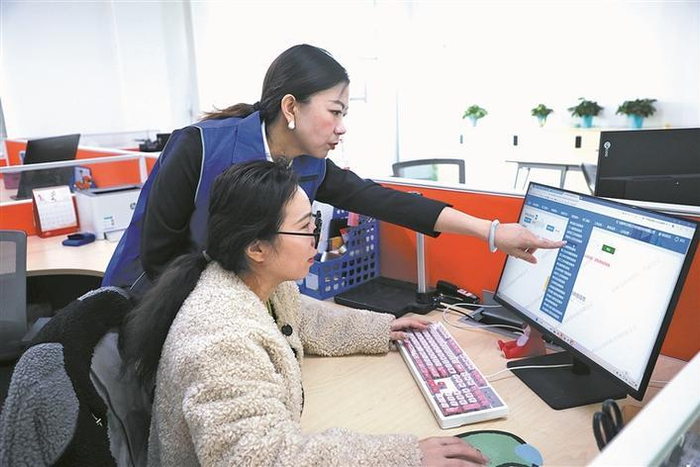 九师白杨市公共就业和人才服务局工作人员(左)向前来咨询群众讲解就业相关政策(资料图片)。今年以来,九师白杨市实现城镇新增就业3018人,完成兵团下达任务的100.6%;累计发放各类就业补贴资金3534.85万元,惠及130余家企业、6660名劳动者。 兵团日报常驻记者 苟汇敏 摄