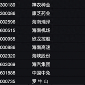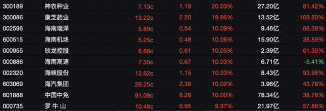 截至12月22日A股收盘,海南自贸港指数内,包括神农种业(300189.SZ)、康芝药业(300086.SZ)、海南机场(600515.SH)、海南高速(000886.SZ)、中国中免(601888.SH)、凯撒旅业(000796.SZ)、海航控股(600221.SH)等在内的15个成分股涨停。