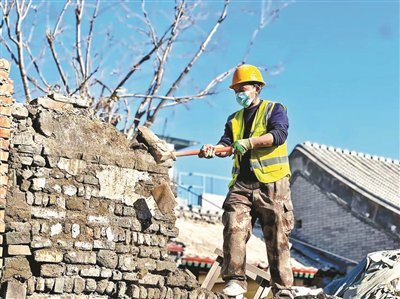 铃铛胡同10号院,工人在局部拆除破损院落墙体