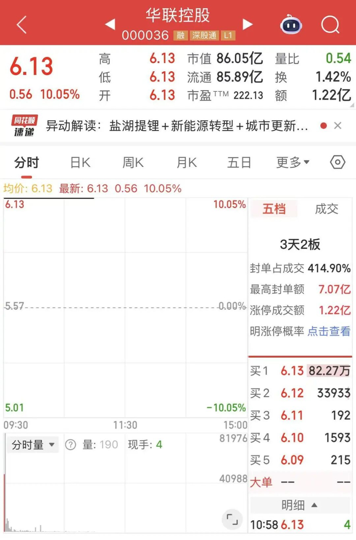 主营房地产业务的华联控股(000036)12月22日晚发出拟并购海外盐湖资产公告后,公司股票23日开盘后一字涨停。截至记者发稿,封单超过82万手。