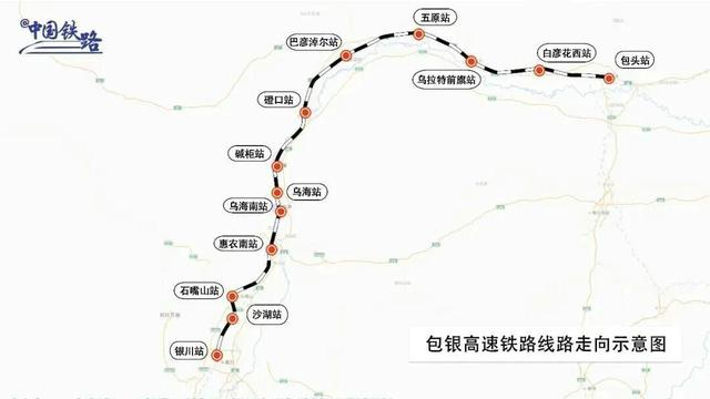包银高铁包惠段起自包头站,经内蒙古自治区包头市、巴彦淖尔市、鄂尔多斯市、乌海市,宁夏回族自治区石嘴山市,接入惠农南站,设计时速250公里,正线全长422公里,其中内蒙古段403公里、宁夏段19公里,共设包头、白彦花西、乌拉特前旗、五原、巴彦淖尔、磴口、碱柜、乌海、乌海南、惠农南10座车站,其中包头、巴彦淖尔、乌海、惠农南站为既有车站,其余车站为新建车站。