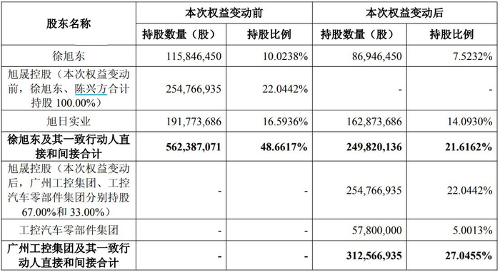 交易方案由两部分组成,一是广州工控集团及其全资子公司广州工控汽车零部件集团有限公司(以下简称工控汽车零部件集团)将从徐旭东及其配偶手中受让旭晟控股100%股权。二是工控汽车零部件集团还将受让旭日实业及徐旭东直接持有的上市公司部分股份。