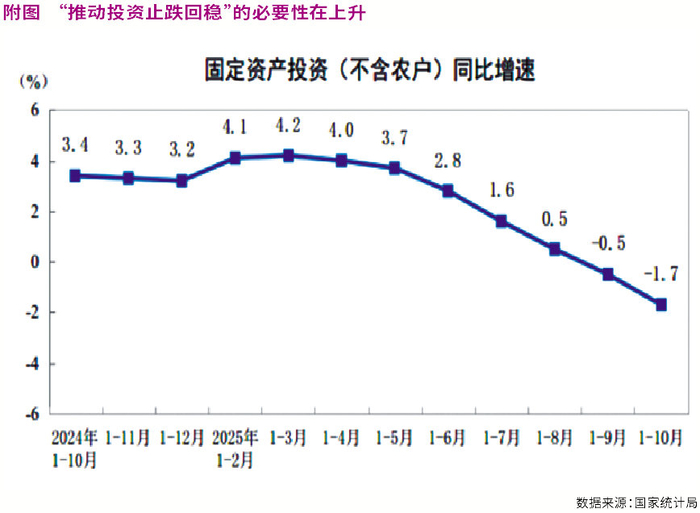 在投资方面,会议着重强调,“推动投资止跌回稳”,是对当前投资增速偏低的回应。根据国家统计局的数据,1—10月全国固定资产投资(不含农户)同比下降1.7%,增速比2024年下降4.9个百分点,投资存在一定的压力。