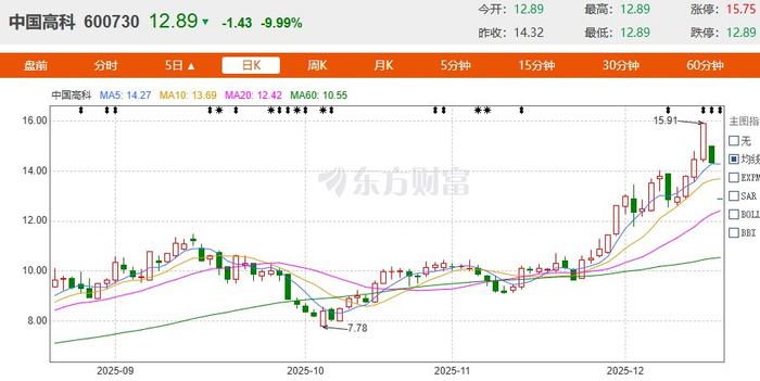 《每日经济新闻》记者查询发现,上述筹划控制权变更的公告发布前,中国高科在3个交易日内(12月10日至12日)收盘价格涨幅偏离值累计超过了20%。此外,2025年1月2日至12月12日(筹划本次“易主”停牌前一个交易日),中国高科的股价从6.07元/股(1月2日开盘价)涨至15.91元/股,累计上涨163%。
