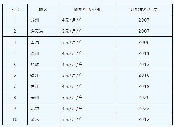 四是衔接周边城市。目前省内苏州(2007年)、南京(2008年)、徐州(2011年)、镇江(2018年)、宿迁(2019年)、泰州(2020年)、无锡(2023年)及我市金坛区(2012年)等地个人负担的生活垃圾处理费已改为按住户随水征收方式。
