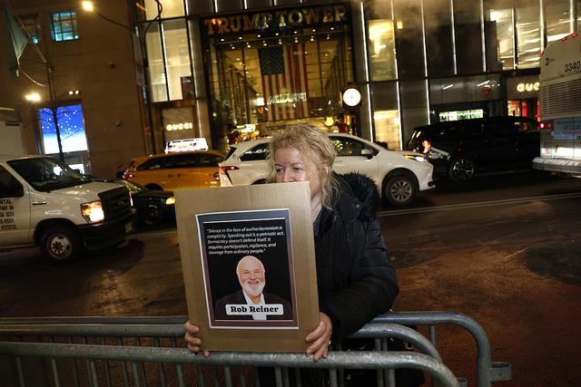 有社会活动人士在纽约特朗普大厦前,手举罗伯·莱纳的头像缅怀他。