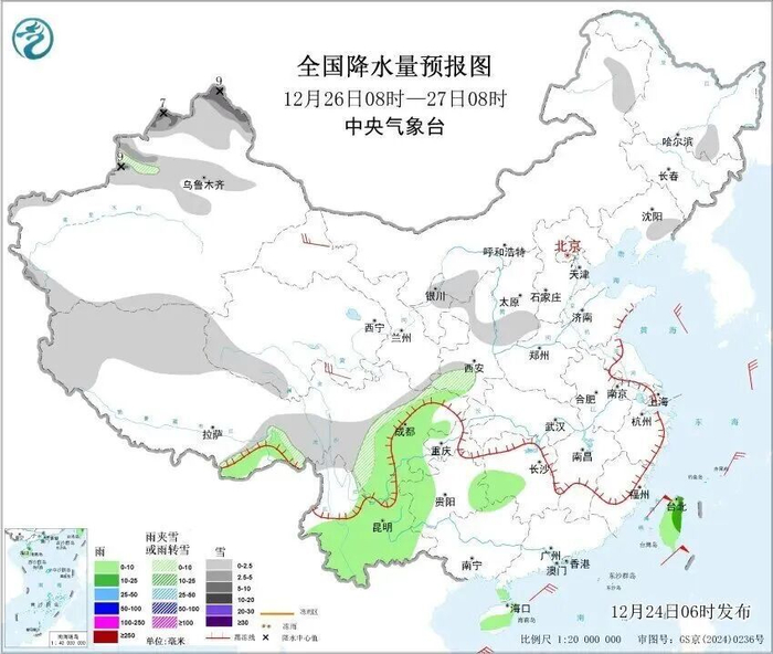 中央气象台预计,明天,新疆北部、内蒙古西部、西藏东部、青海北部和东南部、甘肃河西、黑龙江中部、吉林东部、山东半岛、西南地区北部等地部分地区有小雪或雨夹雪。西藏东南部、甘肃南部、湖南东南部、江西西部、福建中东部、云南东部、华南西南部、海南岛、台湾岛等地部分地区有小到中雨。