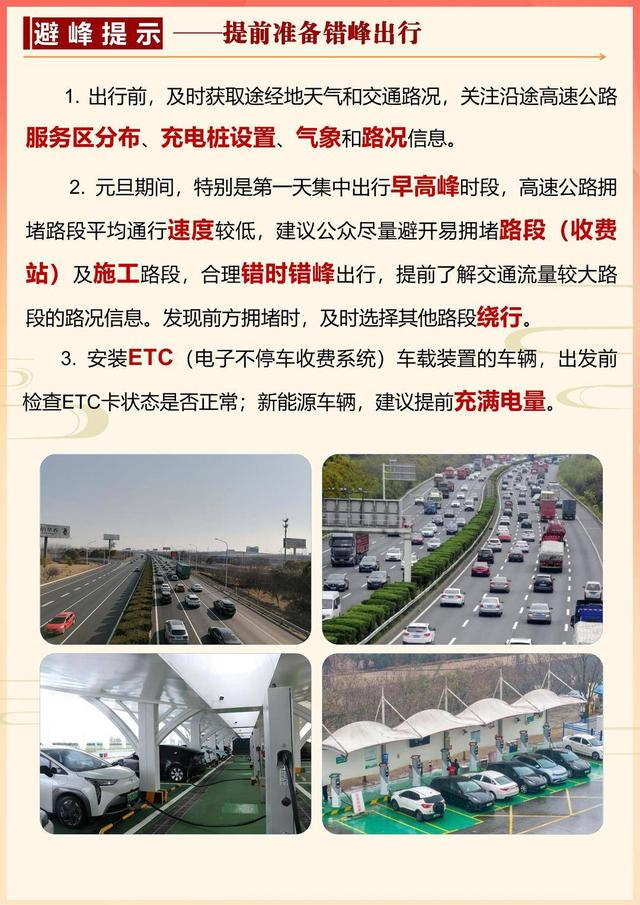 节日期间,天气总体较好,适宜出行,中短途旅游需求会有所释放。预计全省高速公路交通流量较平日小幅增长,预计增长7%;高速公路省内跨市出行、跨省出行将会有所增加,过江、省界流量较平日小幅增加;假期高速公路路网运行将呈现早晚双峰特征。