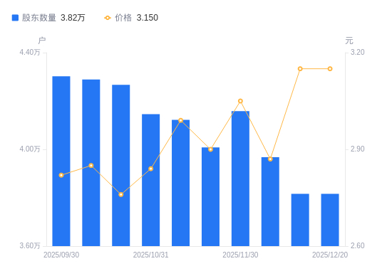 近一年(2024年12月31日至2025年12月19日),康欣新材A股股东户数从4.14万户,减低至3.82万户,降幅7.92%,区间股价上涨48.58%。