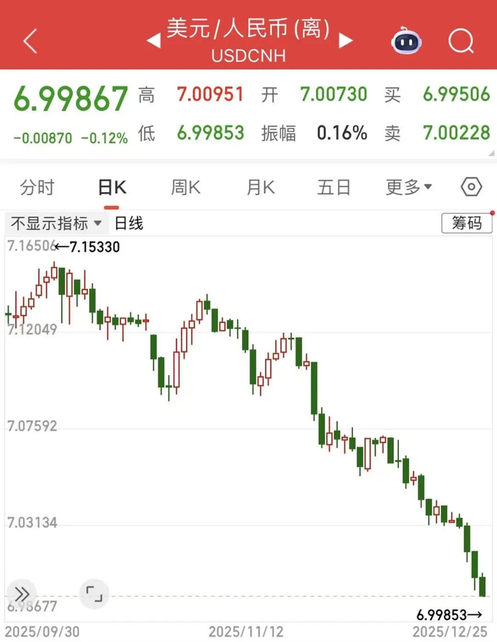 临近年末,外汇市场波澜再起。2025年12月25日,离岸人民币对美元汇率升穿7.0这一关键心理关口,最低触及6.99853元,为2024年以来的首次。与此同时,人民币对美元中间价连续调升,于25日报7.0392,同样创下逾一年新高。