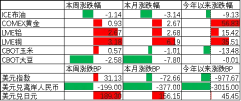 上周各类期货价格有所上行,其中大豆跌幅最大,伦铜涨幅最大。ICE布油收于60.12美元,跌1.14%,COMEX黄金收于4368.7美元,涨0.93%。