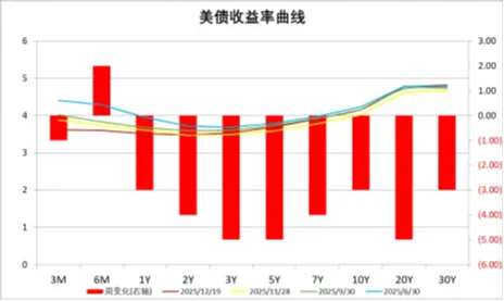 上周,国内公布11月经济数据。其中,社零、地产投资及工业增加值均有所走弱,仅制造业投资维持一定韧性,整体看内需仍维持偏弱。往后看,近期中美贸易摩擦有所缓和,但逆全球化趋势短时间内难以逆转。内需方面,随着地产政策继续放松,同时生育补贴有所加码,对经济增速能够形成一定支撑,海外不确定性较大背景下经济基本面预计将出现一定的震荡回升。海外方面,11月CPI及核心CPI走弱显示通胀降温,同时失业率也由9月的4.4%上升至4.6%,美国经济开始出现一定的转弱迹象。降息预期方面,虽然通胀及就业有所下行,但美联储官员发声表示降息并不紧迫使得预期有所降温,目前中性预期26年1月降息的概率由此前的24%降至22%。
