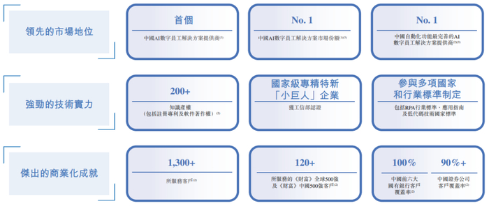 公司已服务众多行业多家头部企业,并取得市场领先地位。按市场份额计,公司于2022年至2024年连续三年在中国AI数字员工解决方案市场蝉联榜首。整个业绩记录期间,公司在此市场服务的大中型企业数量亦位居市场首位。公司的市场领先地位尤其体现在金融服务领域,自2022年至2024年连续三年市场份额稳居第一。