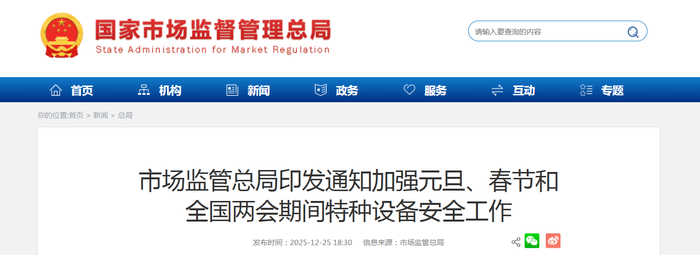 市场监管总局印发通知加强元旦、春节和全国两会期间特种设备安全工作