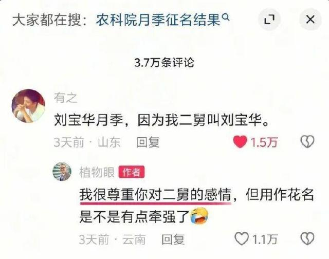 “刘宝华月季,因为我二舅叫刘宝华。”“用作花名是不是有点牵强了。”“还好,不算牵强,他长得像花一样。”最近,一个新品种月季的全网征名帖火了。
