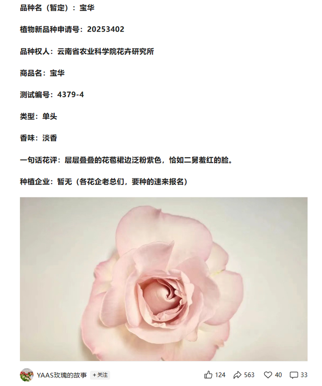 宝华月季的故事还没有大结局,在宝华月季网上申报后,植物眼透露了给这一品种月季命名的更多背后故事,一开始其实是云南省农科院育种的蔡老师为了给这个品种的月季取名字,翻烂了《诗经》也没有搞定,所以才来发帖求助网友,意外获得了宝华的名字,并在评论区中发现,很多网友给出的名字都是来源于与自己亲近的长辈,“我的奶奶叫兰玉,她很喜欢花,奶奶过了一辈子苦日子,养大了单亲家庭的我,她总说老了就能享福了,最后因病去世没能享到一点福,可不可以叫兰玉月季。”“我奶奶叫繁英,繁花似锦落英缤纷,用作花名很合适,我也想她能重活一世。”“可不可以选一朵淡白色的月季叫桂云,我姥姥马桂云87岁了,姥姥把我一手拉扯大,她坚韧顽强,我想给她争个‘诰命’,流芳千古。”
