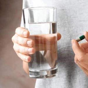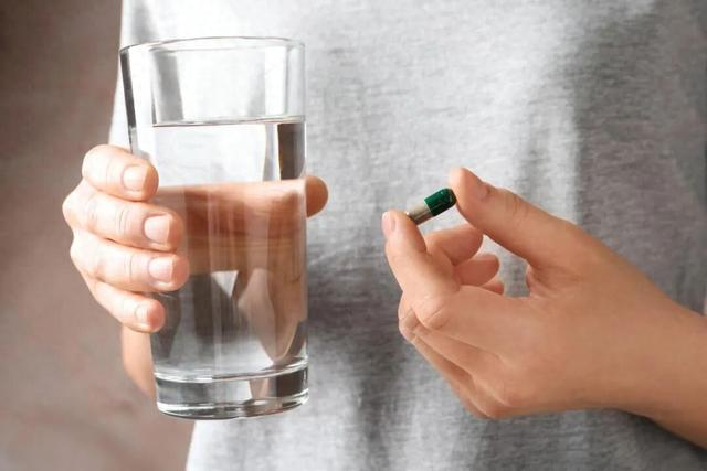 在服用胶囊前,先喝一口水润一润嗓子,避免吞咽时胶囊粘在食道上,接着将胶囊放入口中,喝水将其吞下。
